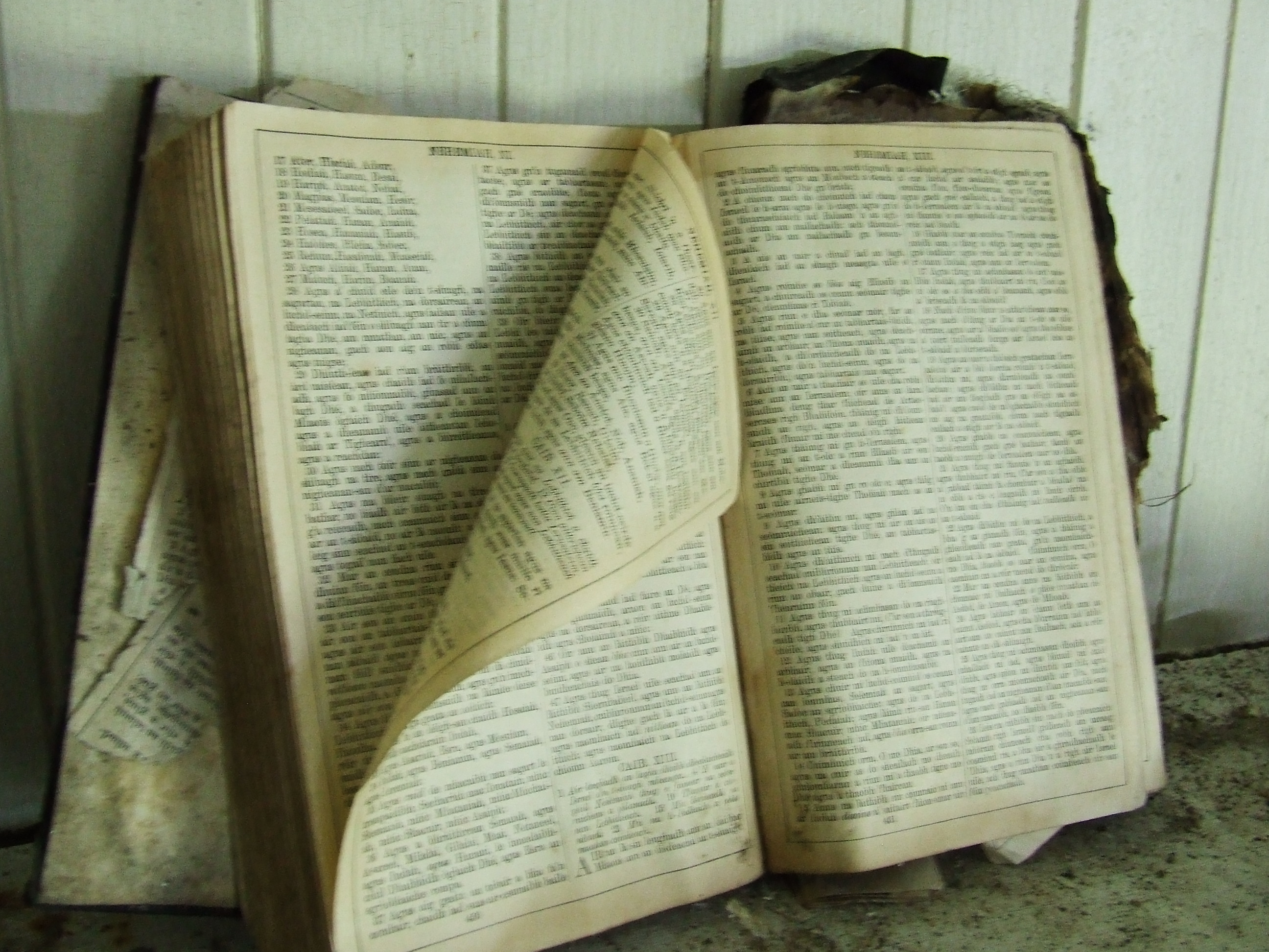 An open bible left on the fireplace of an abandoned croft house on Bernera, an island just off Lewis in the Outer Hebrides.