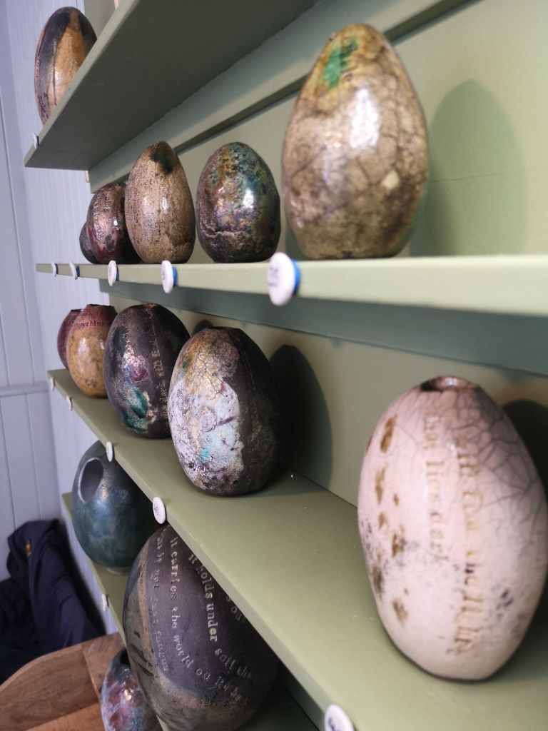 Suddenly I find myself sharing the deepest parts of life with others. Perhaps some words in a piece of art have unlocked something. The shape of something half forgotten which then bursts out into the space like a brightly painted trout. I have had several of those today and each one has felt precious. In a world where so many people have left Church and formal religion behind, perhaps art and poetry – even pottery – might be one of the ways we can still connect, first with each other, then with something else, that I would tentatively still call god – even if she takes shapes I no longer know or wish to define.
