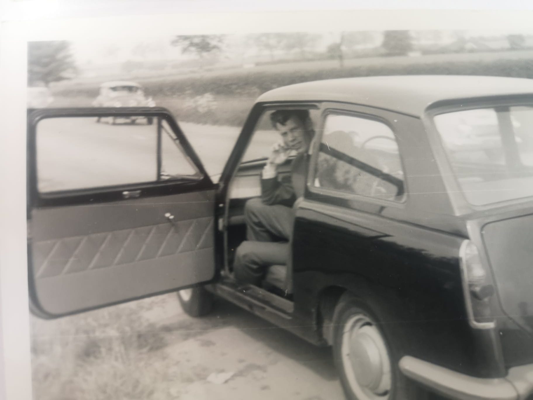 Behind the wheel of an Austin A30, around 1965