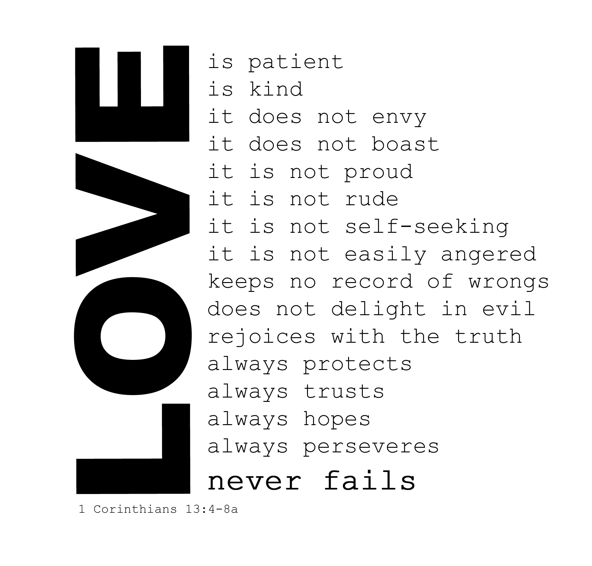 The kind of love that is patient, kind and does not envy, boast, act proudly or haughtily. The sort of love that is not rude, or self-seeking, is not easily angered, and keeps no record of wrongs. A love that does not delight in seeing evil in others but makes partnerships of truth. A protective, trusting, ever-hopeful kind of love that just does not give up. (1 Corinthians 13.)