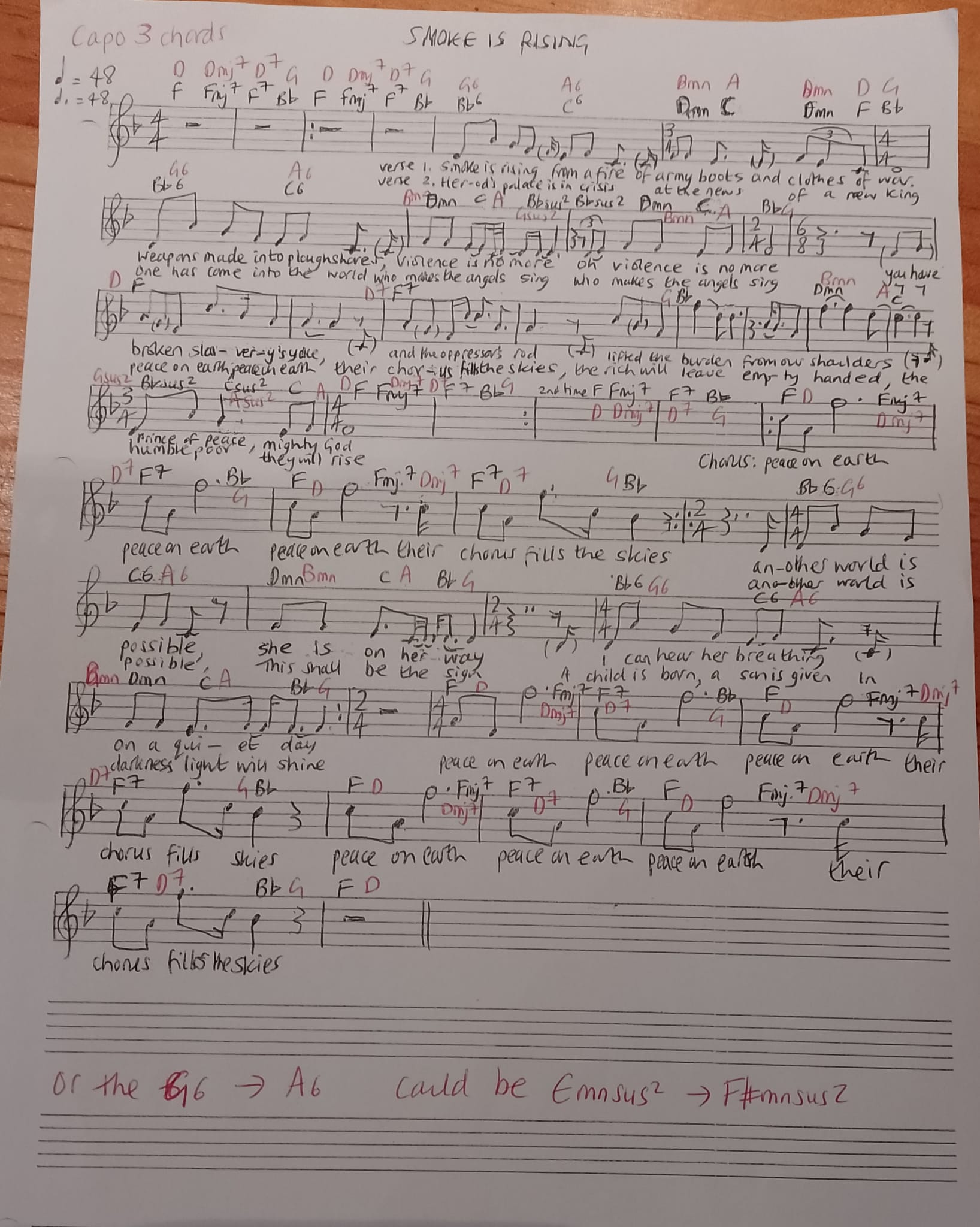 My sister Ruth kindly has written out the melody and chords. I should add that the guitar tuning is DADGAD which sounds lovely. Hopefully you can work out what I am doing from the video if you go that route and like me are not used to that. That’s how I learned it from Niall. I should say I am singing it a bit lower than Niall as I struggled to reach the top note in F. Ruth has written chords in F and in D and unhelpfully I am playing it in E flat!