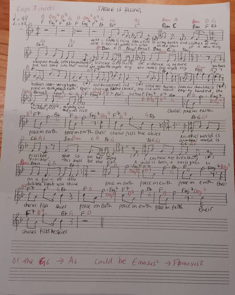 In a world with so much brutality and violence the image of a fire burning army boots and clothes of war struck a chord and a deep sense of advent longing for another possible world. That turned into lyrics for a carol or advent hymn ‘Smoke is rising’. The last verse is quoting Arundathi Roy which many of you will recognise. Niall Dunne has written what I think is a beautiful melody. This came about through a chance conversation at CMS (Niall has started the undergrad pioneer training this year). I’d love any reactions to it. Even more I’d love any of you to try it out and lead it. Let me know how you get on if you do though it’s a bit late possibly for this year now. I imagine it with a huge church or choir but I don’t have one of those!