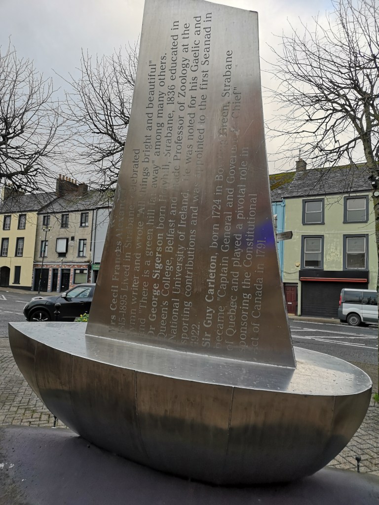 In Strabane town centre there is quite a lot of public art, most notably around the lovely Alley Theatre, but also this piece, which lists a number of famous people born in the town, including former president of the USA, Woodrow Wilson, Musician Paul Brady and writer Flann O’Brien. It does not mention other illuminaries such as William Burke, the 18th Century serial killer, but does give a shout out to a woman called Cecil Francis Alexander who wrote many favourite hymns from my childhood- ‘There is a green hill far away’, ‘Once in Royal David’s City’ and the ubiqiotous ‘All things bright and beautiful’…