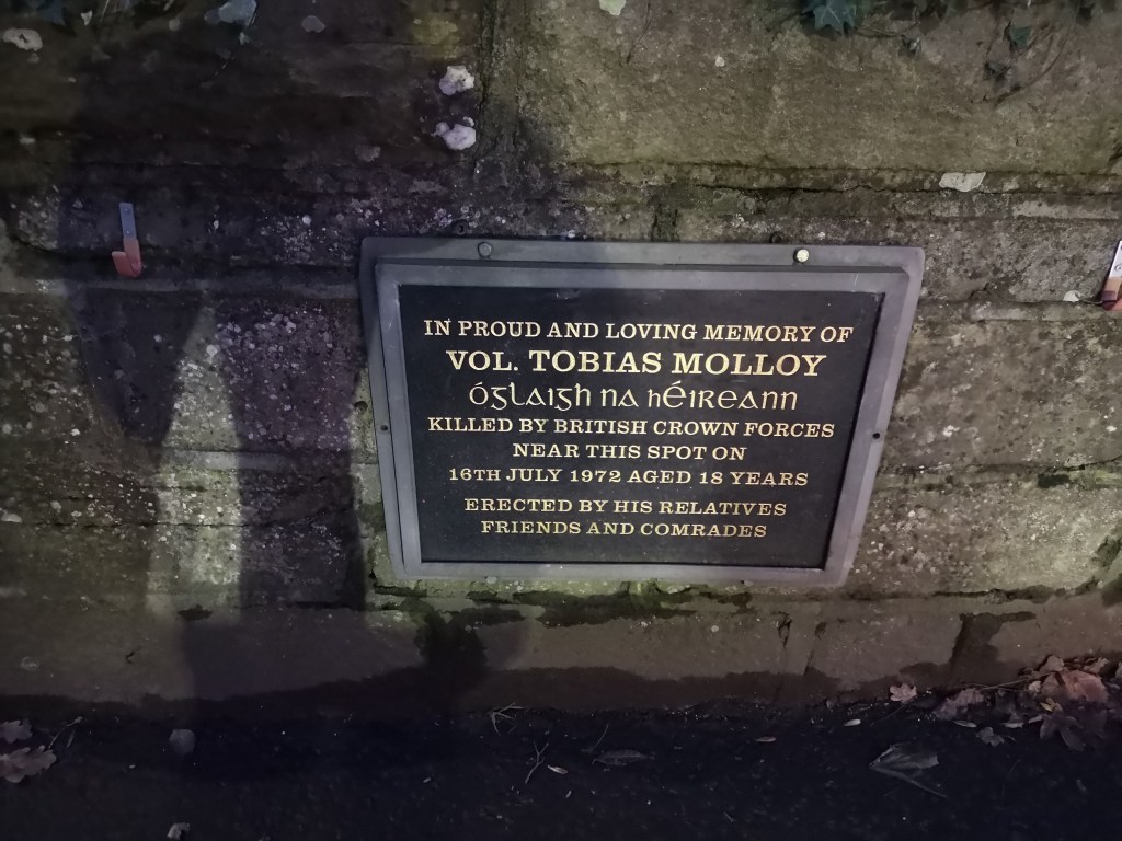 My family were all born into a town called Strabane, right over on what now is the border with the Irish state in Tyrone. It is a bustling booming town now, because of cross-border trade, but until very recently was a place with one of the highest unemployment rates in all of Europe. Strabane was the most bombed town during the troubles, with the highest proportion of it’s citizens killed. It is overwhelmingly Catholic (91%) and as such was an epicentre of republicanism. There are many of these dotted about;